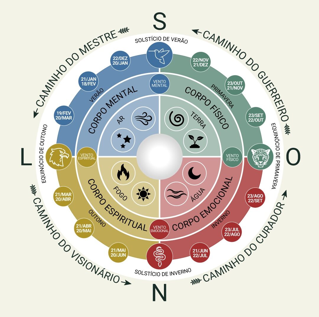 A Roda de Cura é um saber milenar que propõe a reconexão consciente com os ciclos da natureza, entendendo que já estamos imersos neles – mas podemos escolher vivê-los com presença e propósito. Ela se desdobra em quatro ciclos que acompanham as estações do ano e os pontos cardeais: Porta Norte (Inverno), Porta Oeste (Primavera), Porta Sul (Verão) e Porta Leste (Outono). Cada ciclo representa uma fase da vida e oferece elementos simbólicos e práticos para nossa expansão pessoal e construção de autonomia.